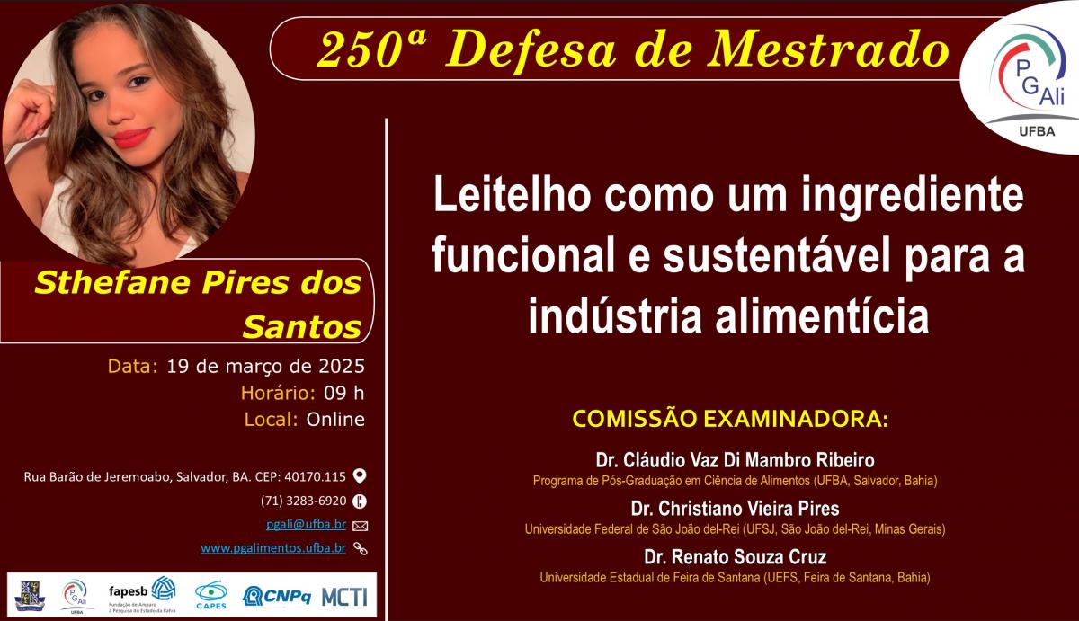 250ª Dissertação de Mestrado "Leitelho como um ingrediente funcional e sustentável para a indústria alimentícia" Sthefane Pires dos Santos