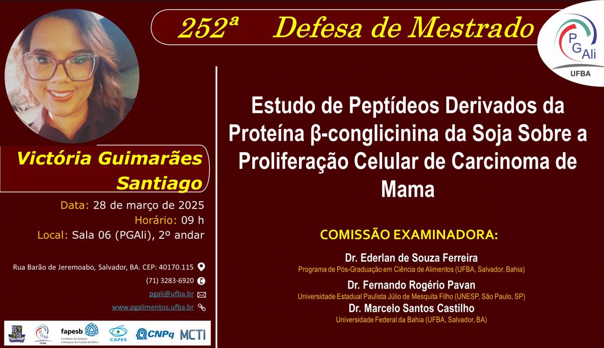 Atualmente, as doenças crônicas não-transmissíveis permanecem como as principais causas de mortalidade e morbidade no mundo. Entre elas, o câncer representa a segunda principal causa de morte, atrás apenas das doenças cardiovasculares; sendo que o câncer de mama se destaca como um dos tipos mais incidentes e letais, exigindo ainda, novas abordagens terapêuticas. Nesse contexto, estudos anteriores têm reportado o potencial anticancerígeno de peptídeos derivados de alguns grãos de leguminosas, com destaque para as proteínas da soja que têm sido extensivamente investigadas. Por isso, esta pesquisa teve como objetivo central – avaliar a ação de peptídeos derivados da proteína β-conglicinina da soja, com efeito sobre a proliferação celular de adenocarcinoma mamário (MDA-MB-231), através de abordagem em in sílico e in vitro. Para tanto, foi realizado uma triagem para seleção de peptídeos com predição de interação molecular com a proteína Bcl-2. Doze peptídeos (ASVSVSF, QEEEH, EEQEW, GTAIL, AIVIL, VIPAGY, AIVVL, EQQQR, ATSDL, PGSAK, ASVCVSL e VIPAAY) com cinco ou mais resíduos de aminoácidos foram preditos com ação anticâncer (ACPred ≥ 0.800). Desses, sete sequências interagiram com as cavidades P2 e P4 do domínio BH3 da proteína Bcl-2, e tiveram o perfil de interação molecular estabelecido e comparado a droga comercial venetoclax. Somente os peptídeos ASVCVSL, ATSDL e EEQEW apresentaram tendências para estruturação helicoidal, condição essencial para ajuste no domínio BH3. Esses peptídeos foram sintetizados, e nos ensaios in vitro reduziram de forma dose-dependente (concentração 25–800 µM) a viabilidade celular da MDA-MB-231. O tratamento com o ASVCVSL, ATSDL e EEQEW levou ao decréscimo em 87, 69 e 42% do crescimento das células quando tratadas com a concentração de 800 µM, respectivamente, comparado ao controle. Embora, a ação do peptídeo ASVCVSL (IC50 = 113.8 µM) tenha sido mais significativa, comparado ao ATSDL (IC50 = 205 µM) e EEQEW (IC50 = 1520.6 µM), ele apresentou o menor índice de seletividade (0,35). Posteriormente, a morte celular foi analisada pela indução da apoptose. O tratamento com os peptídeos ATSDL e EEQEW mostrou um aumento na ligação da anexina V em 3.2 e 5.5-fold e 1.3 e 3.1-fold, enquanto o venetoclax aumentou em 2.1 e 5.3-fold nos tratamentos por 24 e 48 h, respectivamente. Além disso, a indução da apoptose foi acompanhada da diminuição significativa da concentração da proteína Bcl-2, nos tratamentos com o ATSDL, EEQEW e o venetoclax. No entanto, os resultados previstos in sílico sugeriram que os dois peptídeos avaliados apresentam baixa absorção e biodisponibilidade, comparados ao venetoclax. Portanto, o presente estudo apresenta evidências que os peptídeos ATSDL e EEQEW derivados da proteína β-conglicinina da soja, podem exercer ação pró-apoptótica sobre o câncer de mama, por meio modulação da proteína-alvo Bcl-2.