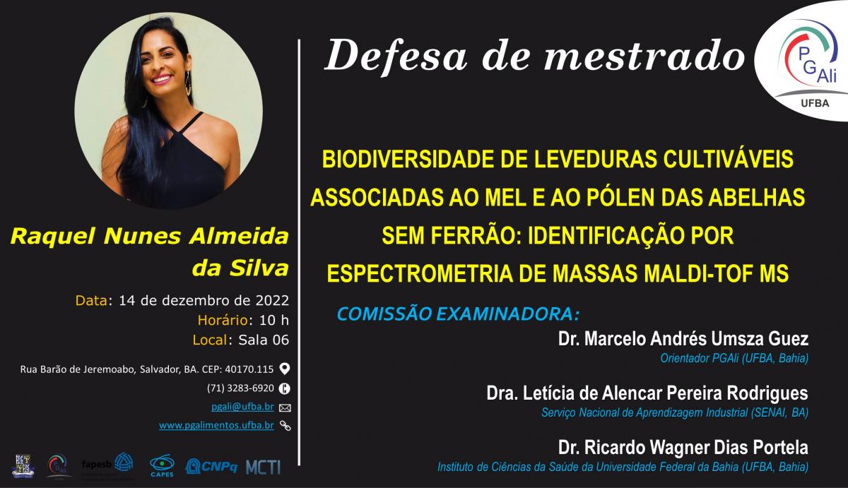 Resumo da pesquisa: Existem mais de 500 espécies e 61 gêneros de abelhas sem ferrão conhecidos mundialmente, distribuídas na América tropical, África, sudeste da Ásia e Austrália. Os meliponíneos armazenam alimentos (pólen e néctar) em potes, visando garantir a sobrevivência da colônia durante eventos de escassez de recursos. O pólen é a principal fonte de proteínas, lipídios e vitaminas para as abelhas; o néctar representa a principal fonte de carboidratos. As características sensoriais, físicas e químicas do mel e do pólen das abelhas sem ferrão são bem distintas quando comparadas ao produzido por abelhas Apis melífera. O trabalho está apresentado em três capítulos, organizados da seguinte forma: o Capítulo I apresenta a Fundamentação Teórica que tem como objetivo contextualizar sobre os aspectos relacionados às abelhas sem ferrão; o mel; o pólen; as características físico-químicas e a qualidade microbiológica dos produtos; a interação de bactérias, fungos e leveduras; bem como aborda o método da espectrometria de massa MALDI-TOF; o Capítulo II apresenta o artigo “Abelhas sem ferrão e as características físico-químicas e microbiológicas de mel e pólen: Revisão de Literatura” que tem o objetivo de relatar de forma breve, alguns dados apresentados na Fundamentação Teórica; e o Capítulo III apresenta o artigo “Diversidade de leveduras em amostras de mel e pólen de abelhas sem ferrão no estado da Bahia: Uso da técnica MALDI-TOF” que tem como objetivo identificar por meio da espectrometria de massas MALDI-TOF as espécies de leveduras do mel e do pólen das abelhas Melipona scutellaris, Nannotrigona testaceicornes e Tetragonisca angustula. Os dados obtidos com a Revisão de Literatura mostram que o mel de meliponíneos possui alto teor de umidade que varia de 23 a 37,5 %; acidez total 19,9 a 98,43 meq kg-1; e açúcares redutores 43 a 75,5 %. O pólen possui alto teor de umidade variando de 37,12 a 53,93 %; proteínas 19,7 a 37,63%; lipídeos 2,5 a 10,81 %; e fibras de 9,3 a 13,65 %. As bactérias mais associadas às abelhas sem ferrão são Lactobacillus, Bacillus, Streptomyces, Clostridium, Staphylococcus, Streptococcus, Enterobacter, Ralstonia, Pantoea, Pseudomonas, Fructobacillus, Lysinibacillus e Neisseria. As leveduras mais observadas no mel são Metschnikowia, Starmerella, Zygosaccharomyces, Candida, Debaryomyces, Dekkera, Kloeckera e Pichia. E os fungos filamentos Aspergillus, Penicillium e Talaromyces. No pólen pode-se observar a presença de bactérias como Lactobacillus, Bifidobacterium e Bacillus; leveduras como Starmerella e Zigosaccharomyces osmophilus, e os fungos Penicillium e Talaromyces. O artigo apresentado no Capítulo III identifica nove espécies de leveduras: Candida maltosa, Candida norvegica, Kazachstania telluris, Schizosaccharomyces pombe, Candida shehatae var. insectosa, Candida guilliermondii, Brettanomyces bruxelensis, Kazachstania exigua, Candida lactis-condensi associadas ao mel e ao pólen das abelhas Melipona scutellaris, Nannotrigona testaceicornes e Tetragonisca angustula. O desenvolvimento de novas pesquisas sobre as características físico-químicas do mel e do pólen de abelhas sem ferrão pode contribuir para a construção de legislação específica que define o padrão de identidade e qualidade destes produtos; a identificação de novas espécies contribui com o conhecimento de novas espécies associadas aos produtos, bem como para aplicação biotecnológica.