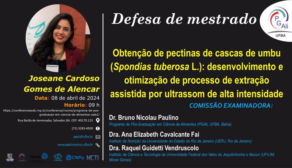 Dissertação de Mestrado “Obtenção de pectinas de cascas de umbu (Spondias tuberosa L.): desenvolvimento e otimização de processo de extração assistida por ultrassom de alta intensidade" (Joseane Cardoso Gomes de Alencar)