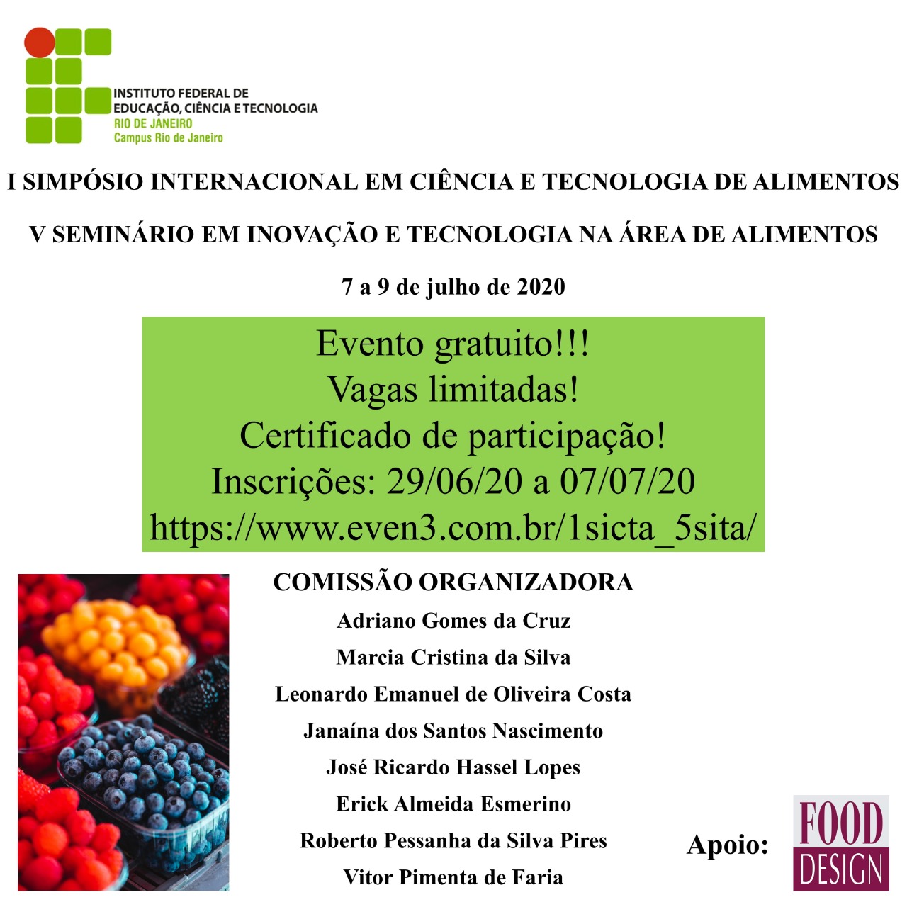 I Simpósio Internacional de Ciência e Tecnologia de Alimentos e o V Simpósio de Inovações em Tecnologia de Alimentos, ocorrerá entre no período de 07 à 09 de julho de 2020. Incrições grátis. Vagas limitadas!